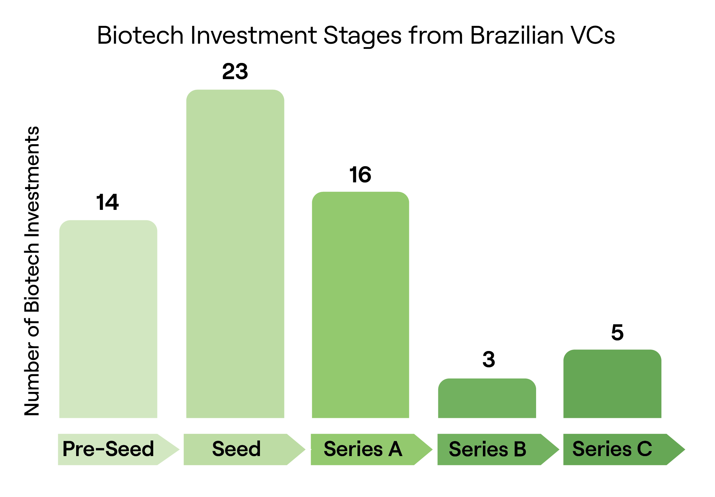 Biotech investments by Brazilian VC firms predominantly target early-stage ventures, with seed investments leading the pack, followed by pre-seed and Series A (refer to Figure 3).