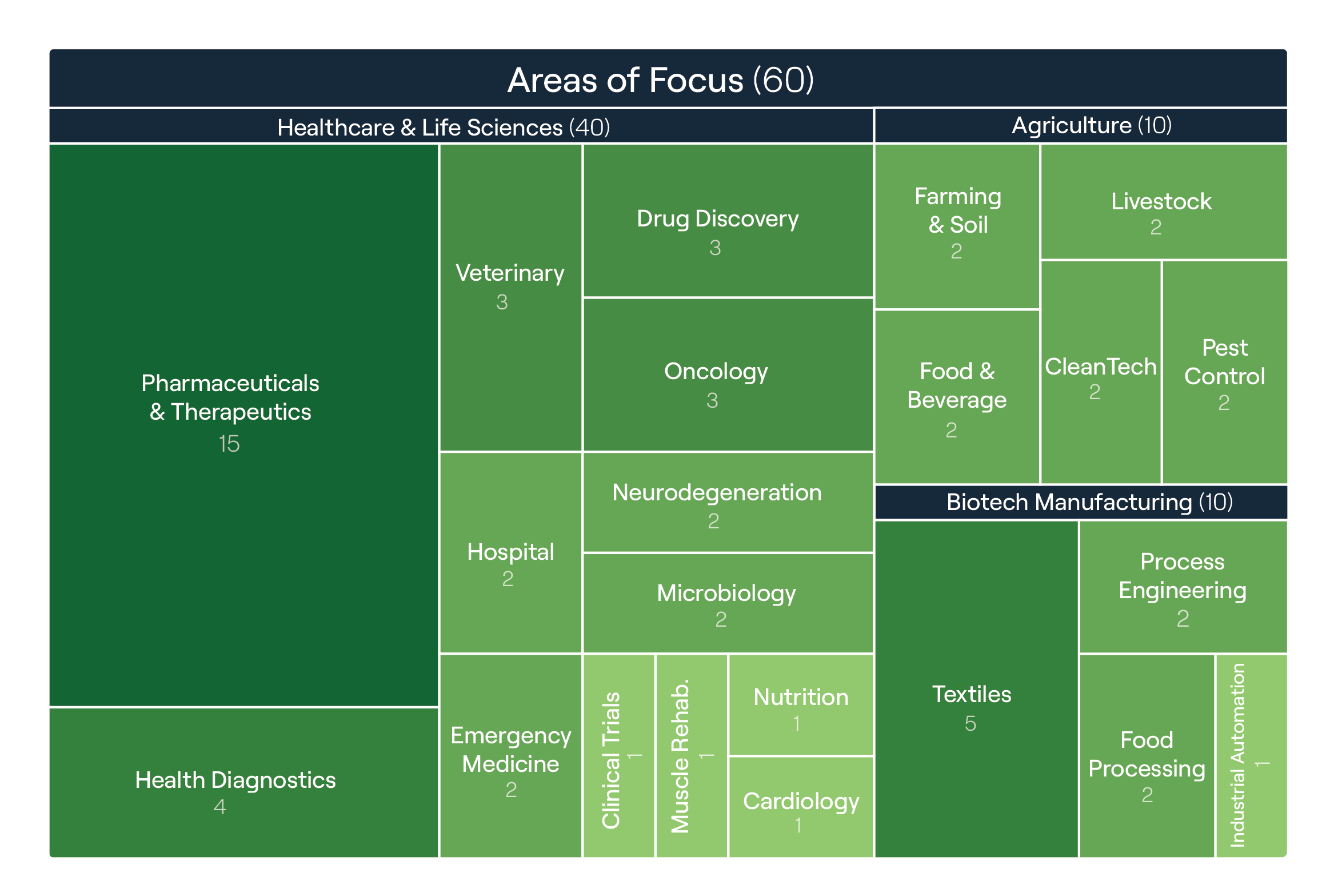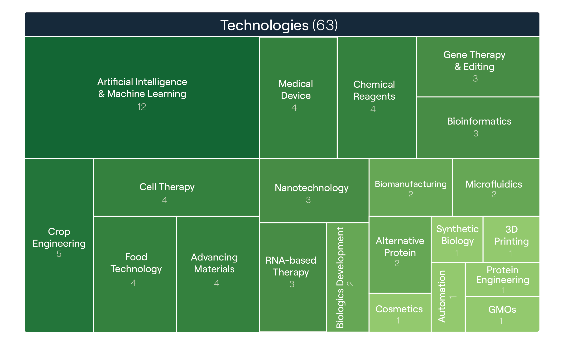 To identify prevailing trends in biotech investments, we analyzed data from the cohort of invested companies, categorizing their areas of focus and technologies (Figure 6). The size of each square represents the frequency of appearances within the biotech investment cohort.