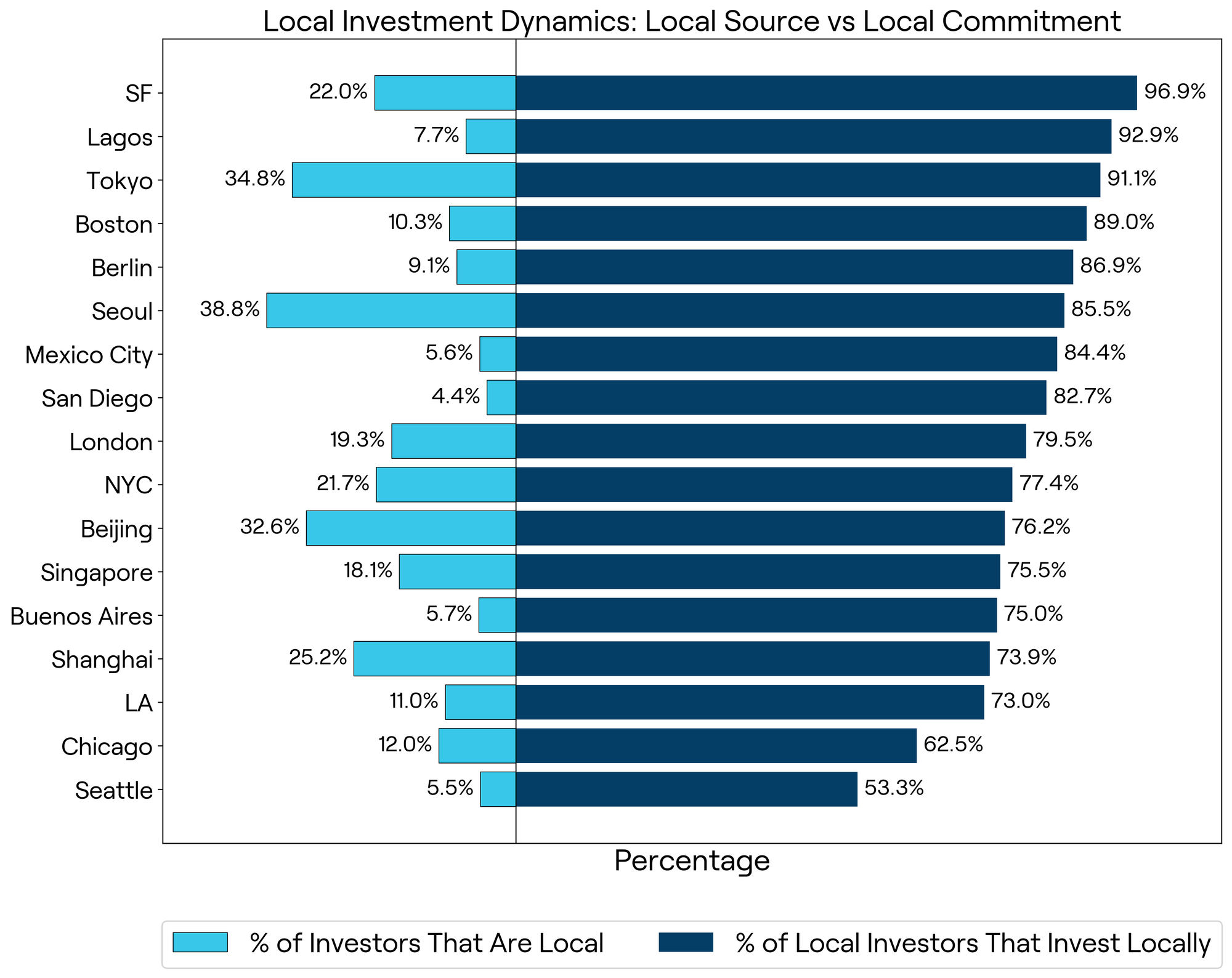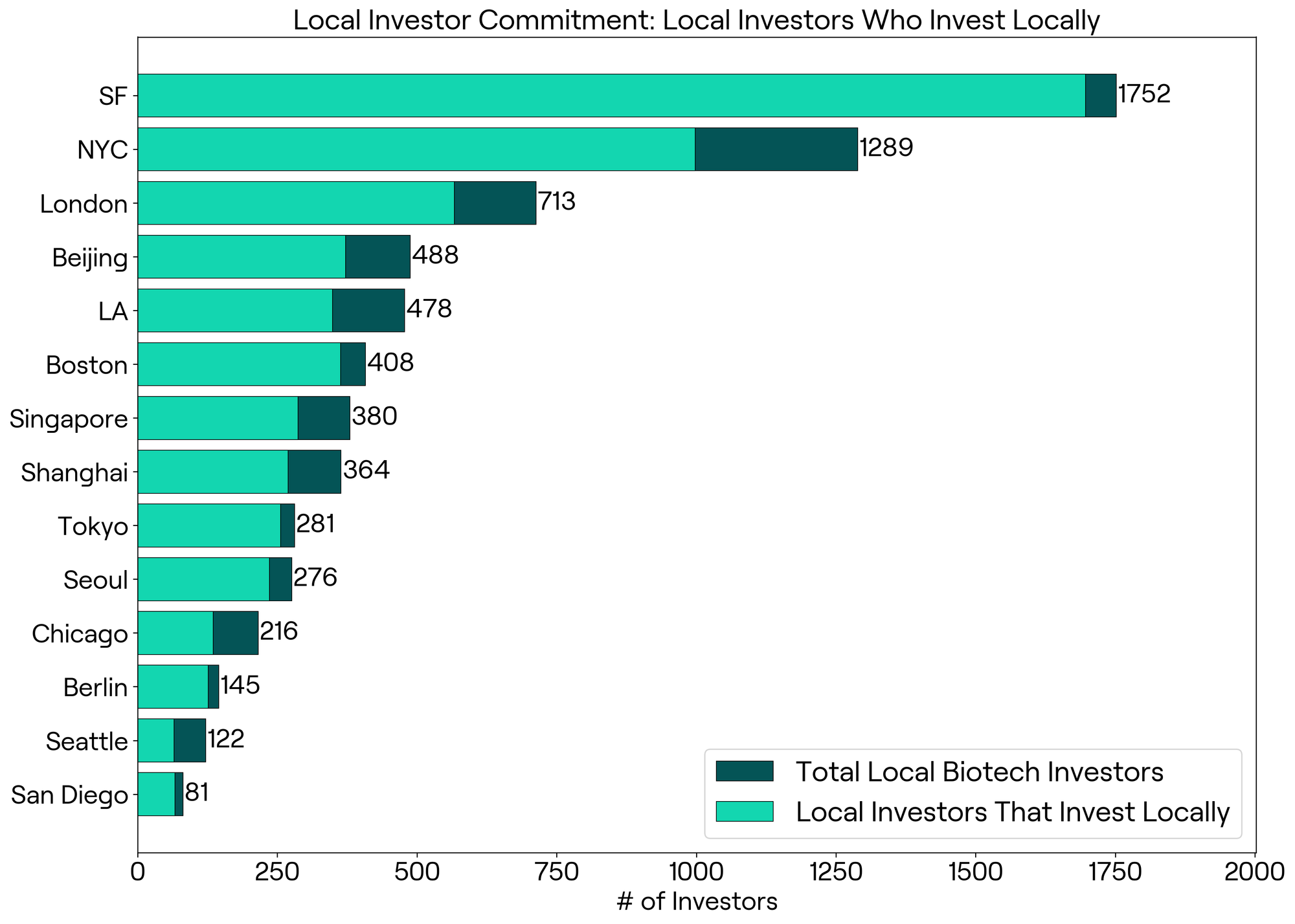 After examining where biotech capital originates and where it ends up, we turned to a second question: are local investors supporting startups in their own cities? To answer this, we analyzed the share of investors based in a given city who had made at least one investment in a local startup. This metric reflects investor loyalty and serves as a powerful proxy for how embedded and engaged those investors are in their regional ecosystems.