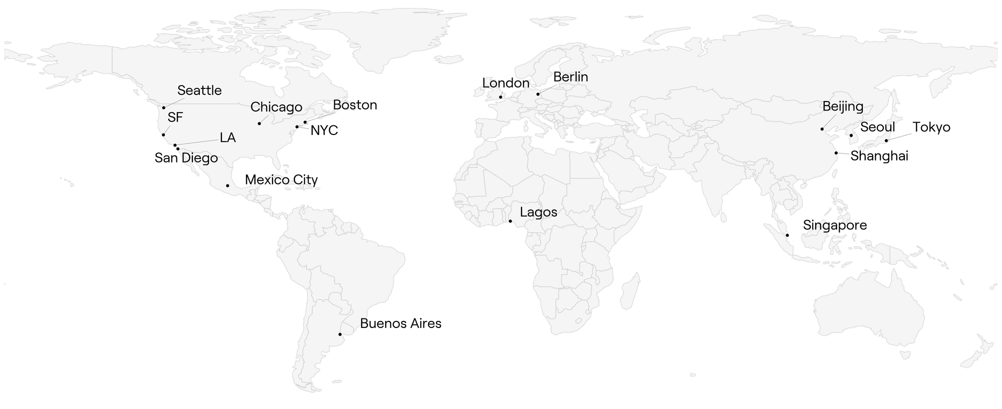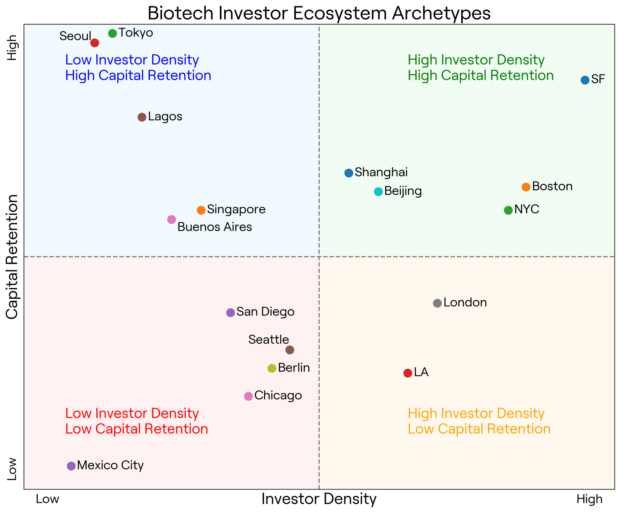 The upper left quadrant features cities like Tokyo, Seoul, and Lagos, which show strong investor loyalty despite smaller local VC communities: early ecosystems with promising internal engagement. Meanwhile, cities like San Diego, Mexico City, and Seattle fall into the “Low Density, Low Retention” category, revealing both a limited investor base and lower levels of local reinvestment.