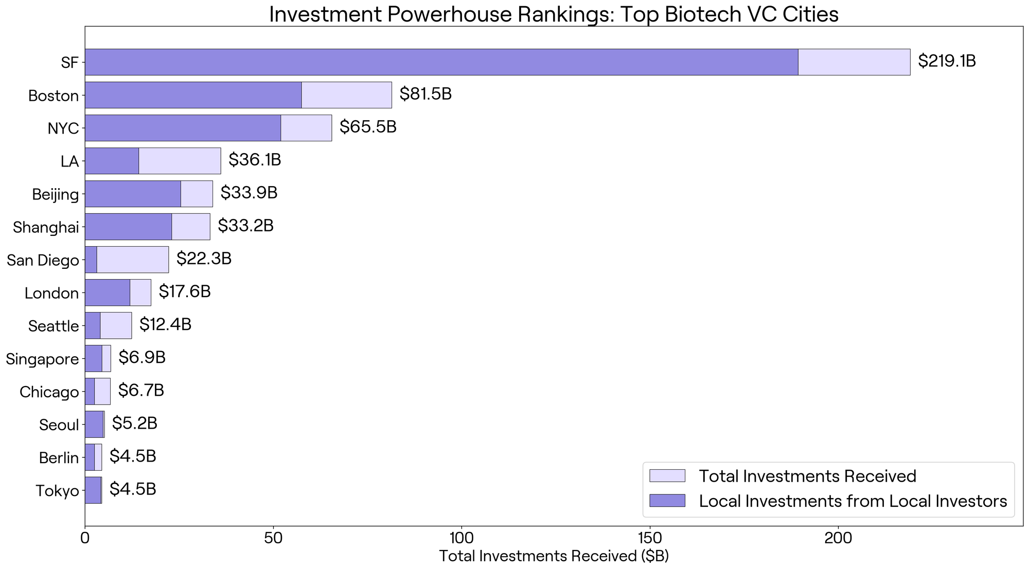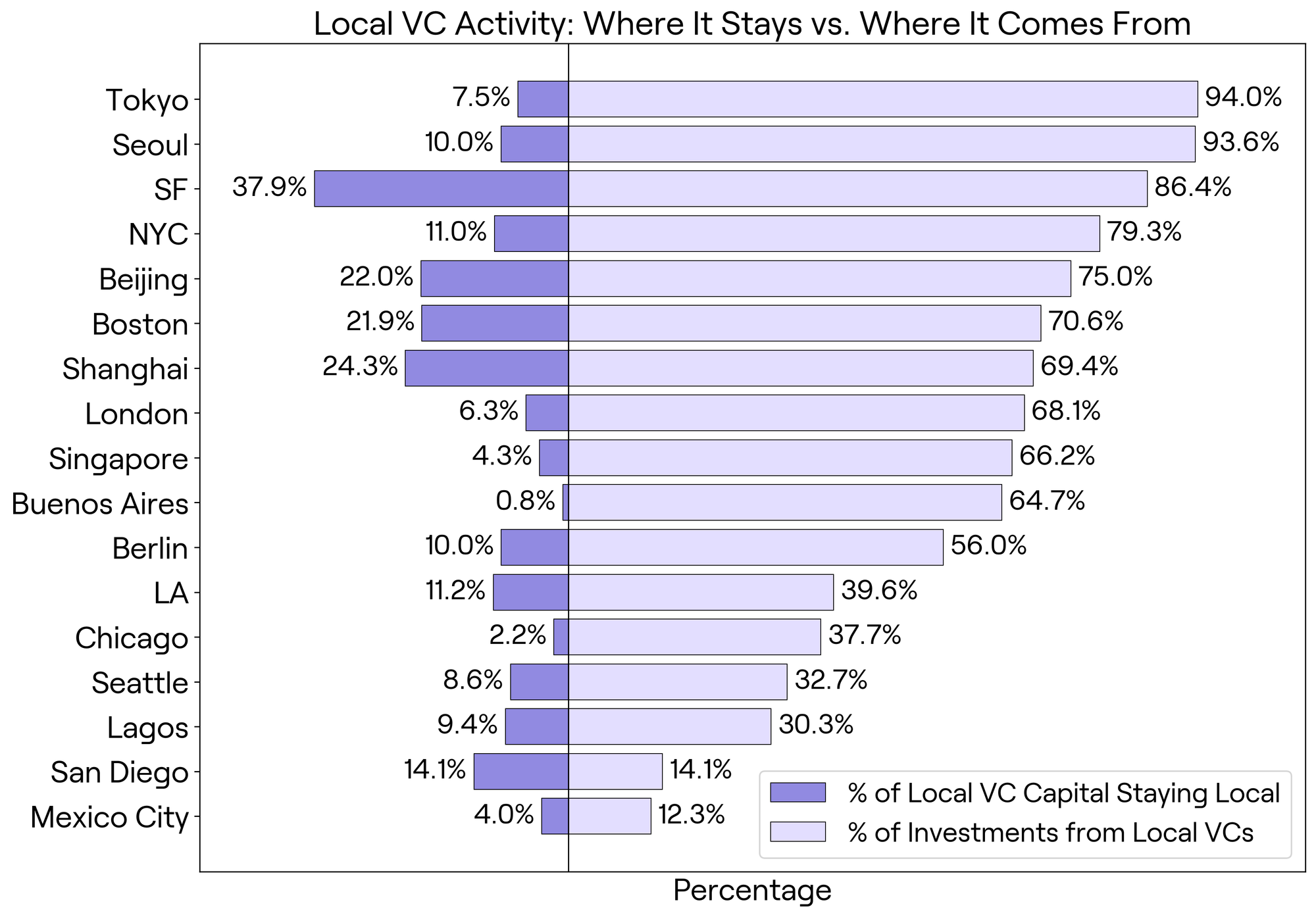 Examining the flow of capital with more granularity, a distinction emerges between the total capital received by startups in a particular city and the amount of venture capital originating from within that same city. Figure 2 illustrates these differences, comparing how much capital was received in each hub versus how much of that capital came from local investors. While major investor cities like San Francisco, New York City, and Boston attract substantial overall funding, a considerable proportion of their local VC capital is deployed in startups outside their home regions, suggesting a willingness to invest beyond geographic boundaries.