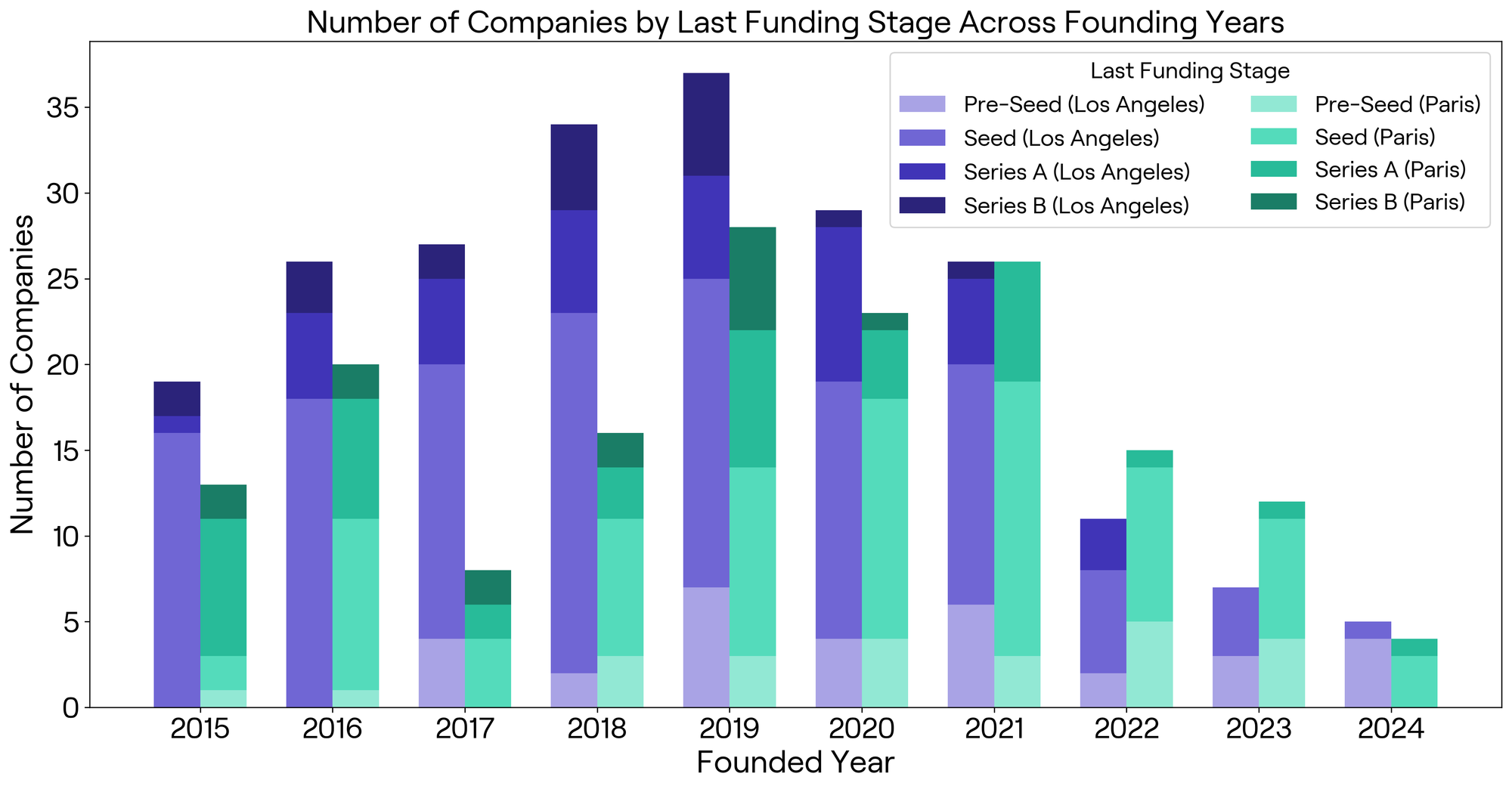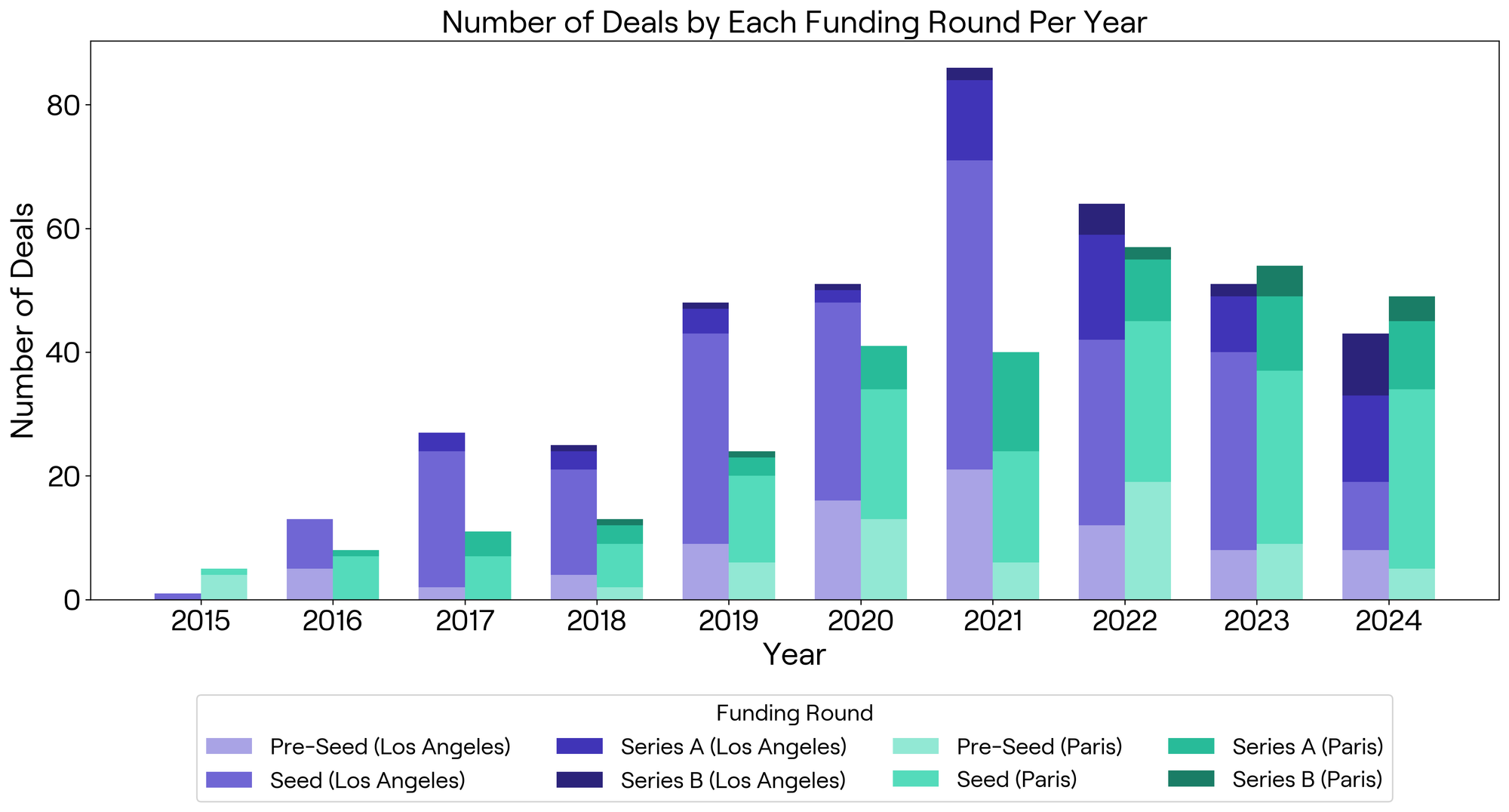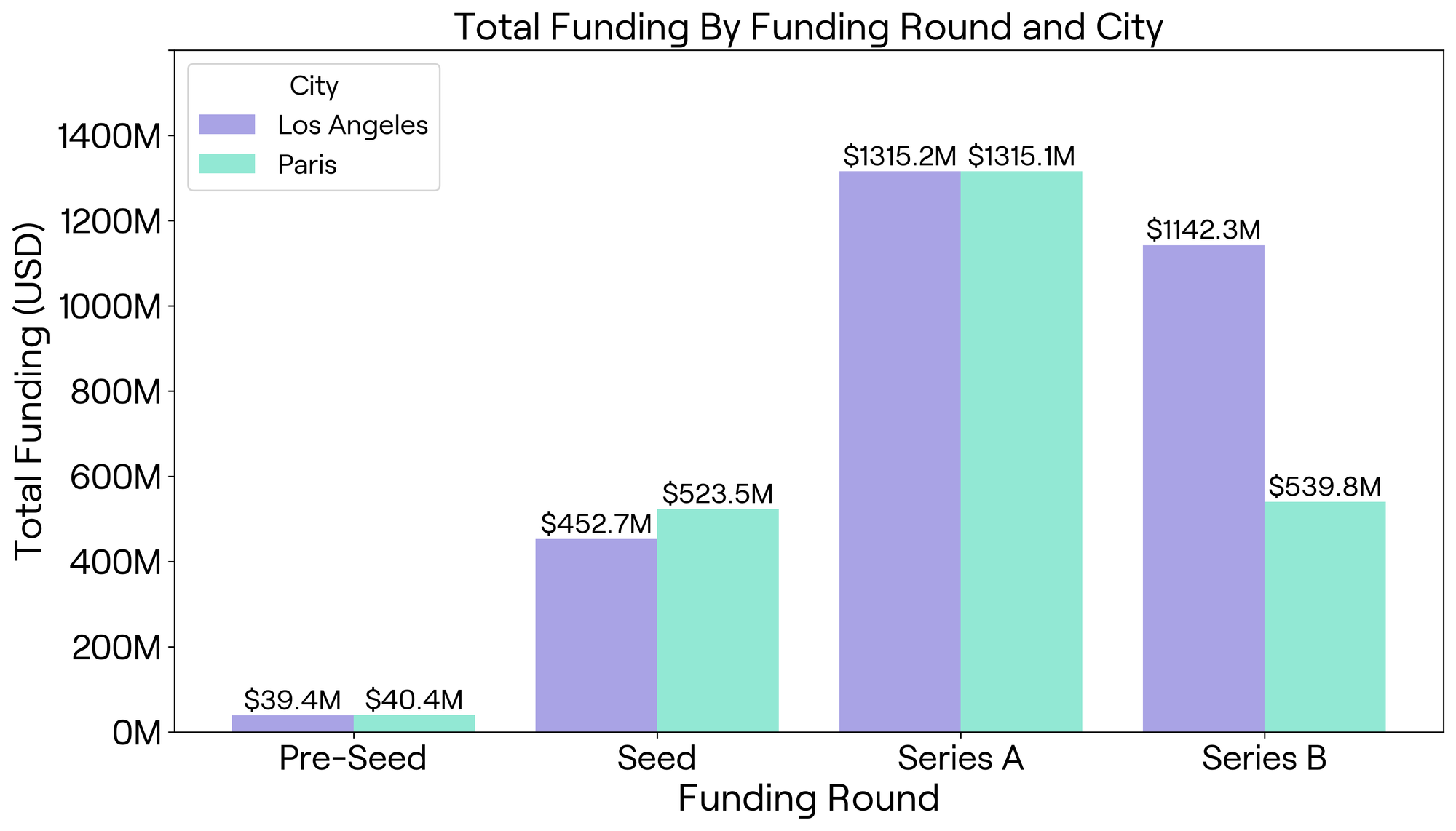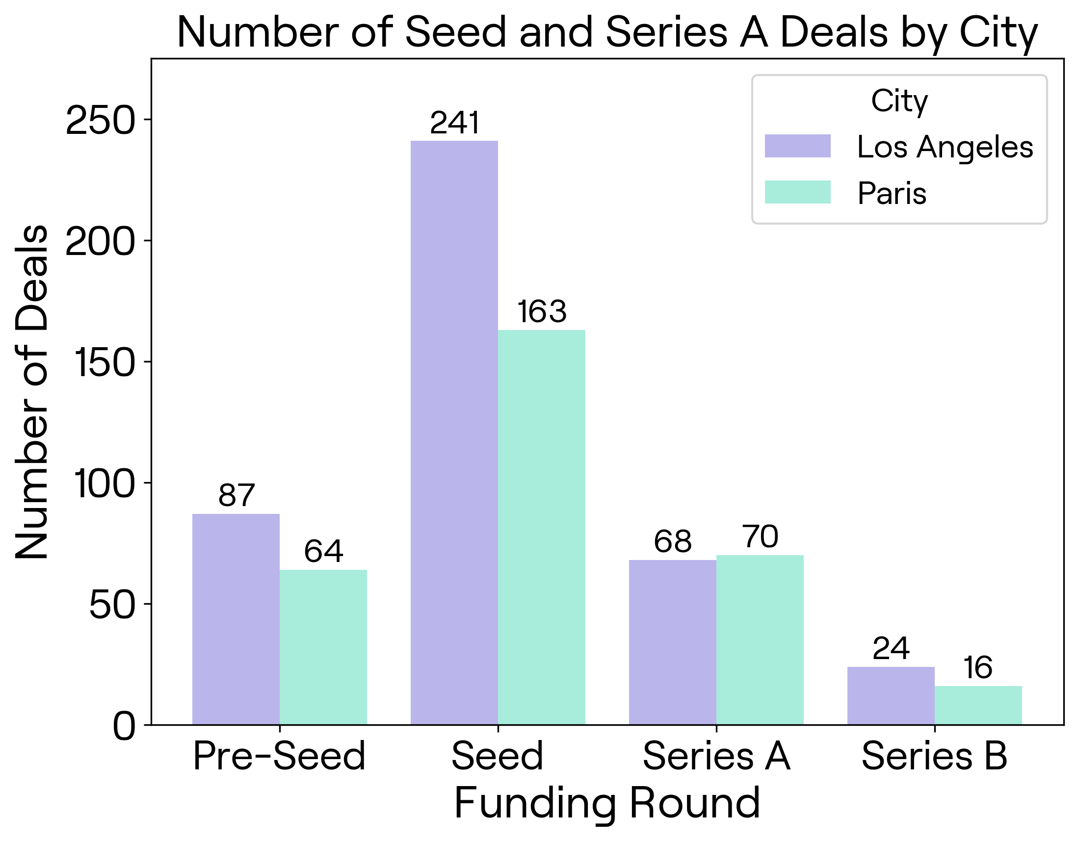 In Seed-stage funding, Paris slightly outpaces LA, with startups raising a total of $523.5 million compared to LA's $452.7 million (Figure 4). However, LA sees more Seed deals (241 vs. Paris's 163), suggesting a more distributed investment scene (Figure 5). In Paris, startups land larger Seed rounds, averaging $4.2 million per deal, nearly 45% higher than LA’s $2.9 million (Figure 4). This could point to Parisian investors betting bigger on fewer, high-potential ventures early on.