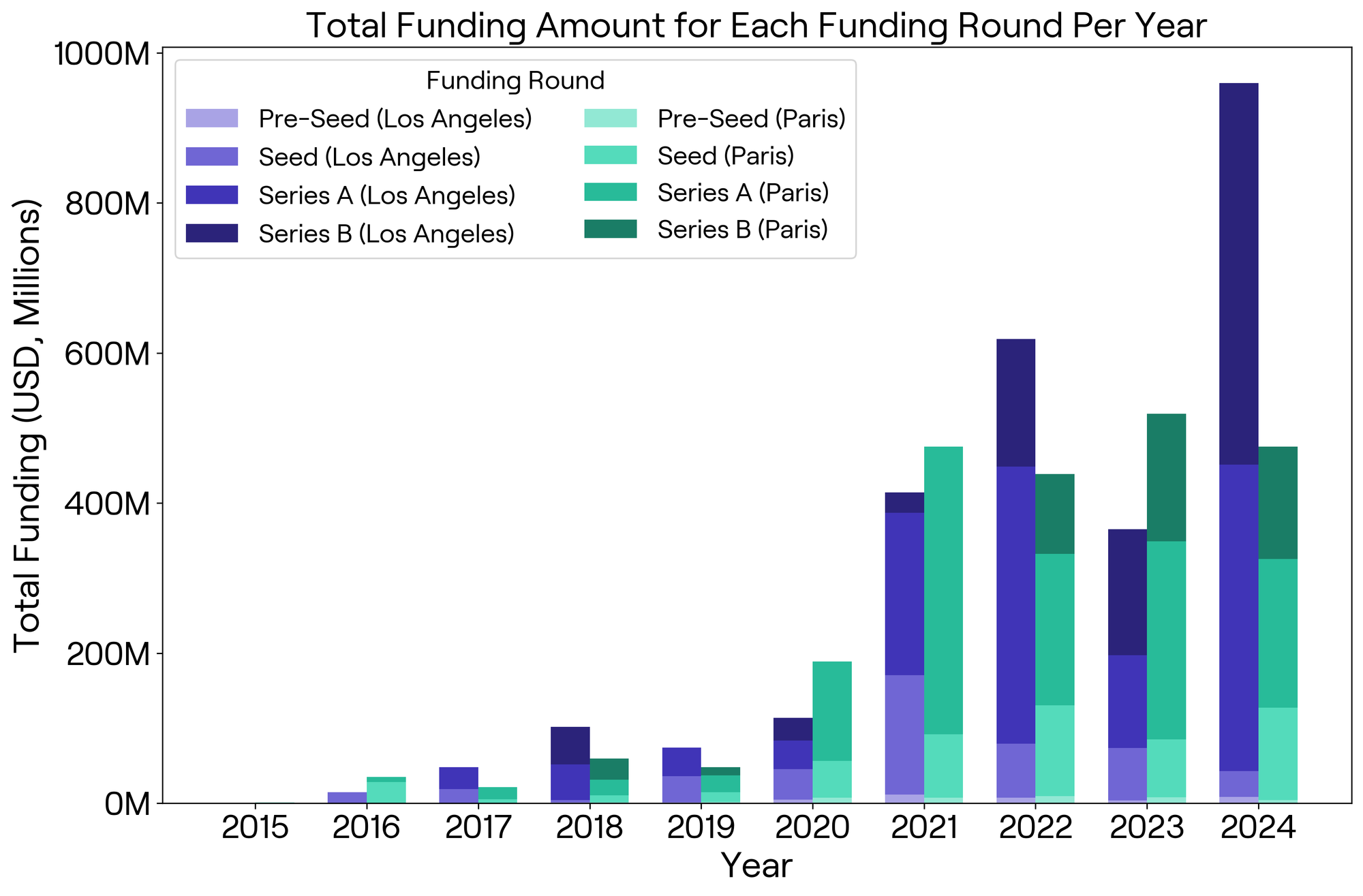 When examining total funding by each funding round per year, LA and Paris demonstrate similar amounts of investments in biotech startups, despite more funding deals in LA between 2016 and 2022 (Figure 2). The difference in total funding across all funding rounds between LA and Paris was the highest in 2024, and drastically higher total funding in LA was driven by large Series B deals, highlighting the city's ability to attract substantial late-stage investments. It is interesting to note that while LA’s total funding fluctuates, Paris shows steadier growth, with a relatively even distribution across funding stages, demonstrating a more consistent investment strategy over the years.