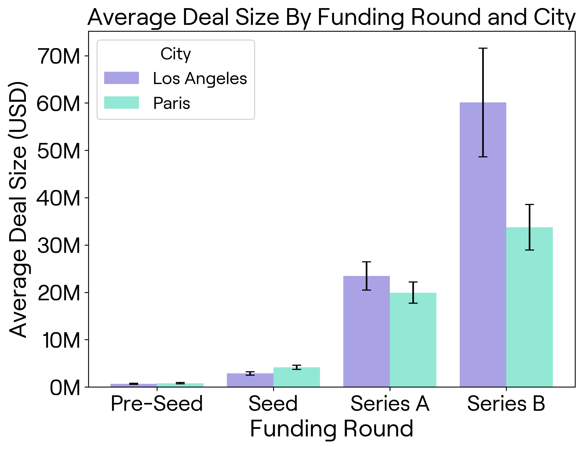 At the Series A level, total funding is nearly identical between the two cities, with LA startups raising $1.3152 billion and Paris startups close behind at $1.3151 billion (Figure 5). But LA startups pull in larger deals, averaging $23.5 million per deal, about 18% more than the $19.9 million seen in Paris (Figure 6). This shift may hint at a higher investor appetite for risk in Paris at the Seed level, while LA becomes more competitive at Series A, attracting larger investments from venture capitalists.