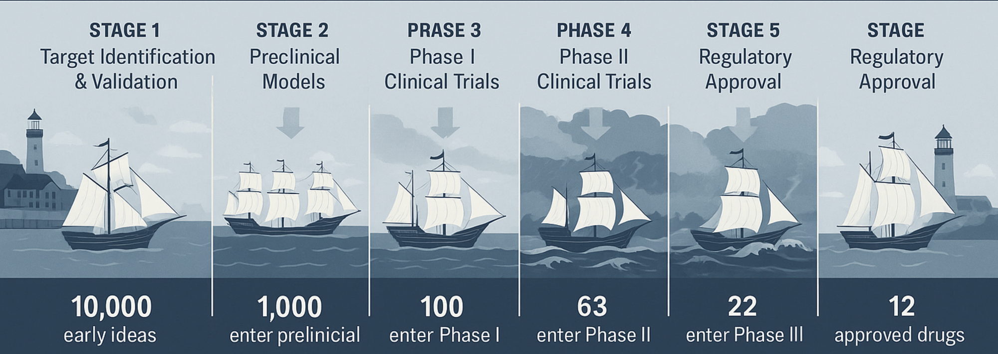 Before a ship even leaves the shipyard, you decide where it’s going. Thousands of potential harbors (biological targets) are charted each year, but most are mirages: poor biology, undruggable structure, or lack of relevance to disease. In the real world, this is where thousands of early concepts — hits from screening campaigns, literature-derived hypotheses, or AI-predicted targets — are filtered. Without strong validation (human genetics, pathophysiology, translational evidence), the ship risks being doomed from the start. The 10% mindset demands ruthless cartography here: you kill bad routes early, no matter how beautiful the sails look on the blueprint.